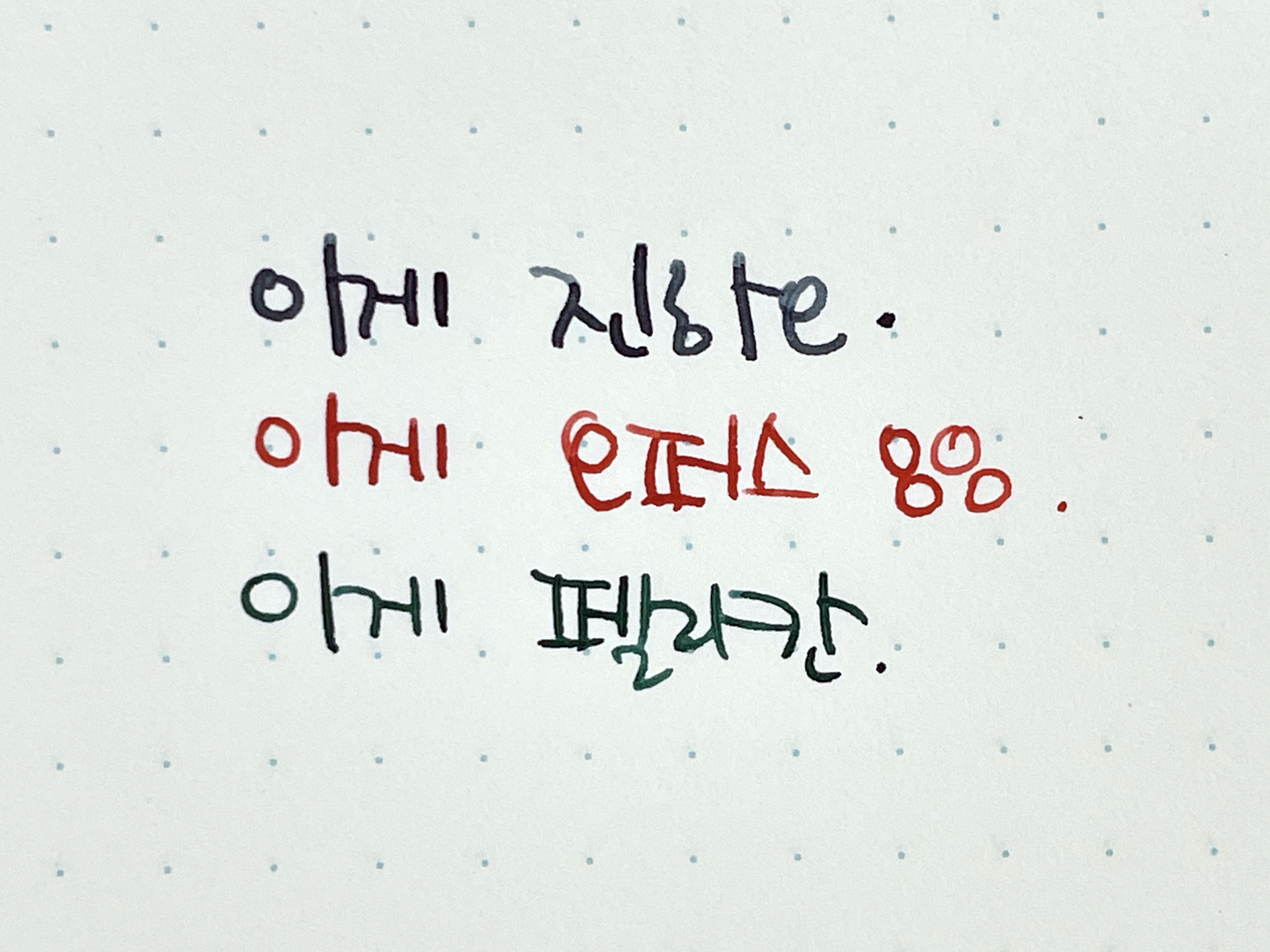 이 펜은 - 소위 '버터필감'이라고 하는 걸 확실히 보여주고 있어. 이걸 좋아하는 사람들은 나보다도 더 현타가 올 것 같아. 어떻게 4500원짜리 펜에서 이런 감촉이 나오지? 그냥 팁만 두껍고 크게 만들면 되는 게 아닐 텐데?