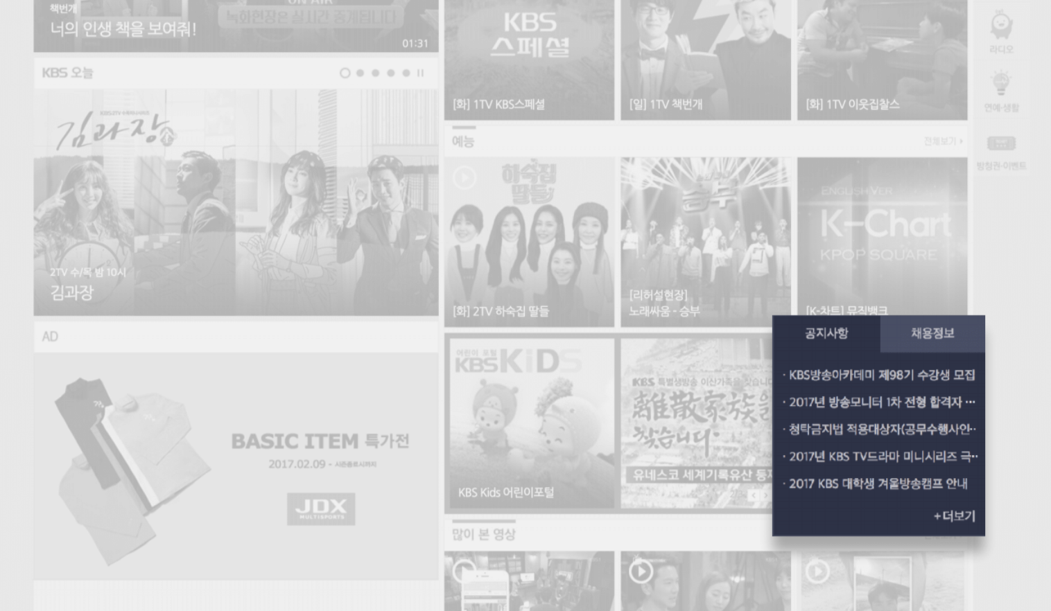 각각의 본부는 자기 나름의 기획/디자인 파트를 가지고 있거나 외주로 해결했고, 서로 협업하기 위한 구조는 너무 약했어. 그나마 디자인을 총괄하는 부서는 이 트리에 들어있지도 않은 - KBS 미디어라는 자회사였는데, 애초에 드라마를 제작하거나 외화 더빙을 하는 등 그야말로 컨텐츠 제작 사업회사이지, UI/UX 업무와는 다소 거리가 있는지라 한계가 있었어.