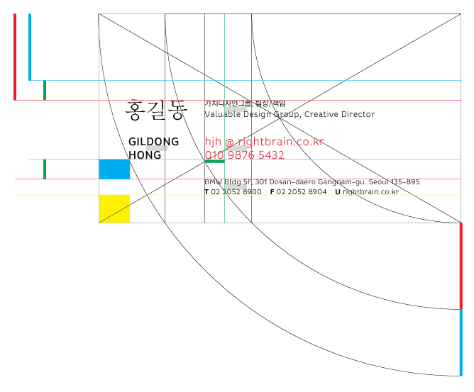 이상으로, 최근에 작업했던 세 개의 명함을 기준으로 일반적인 그리딩 작업을 예시하였습니다. 이들은 미학적으로 우수하지도 않고, 심지어 제 맘에도 그다지^^입니다. 단지 제가 그간 쌓아왔던 경험 – 이런 그리딩이 좀 객관적인 비례를 만드는구나 – 을 바탕으로 한 작업에 불과한 것이지요.