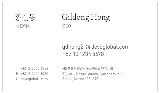 최근에 저는 세 개의 명함을 제작하였습니다. 회사 로고가 바뀐 때와 사옥을 이전한 때, 그리고 devo 라는 계열사가 생겼을 때 명함을 만들었지요.