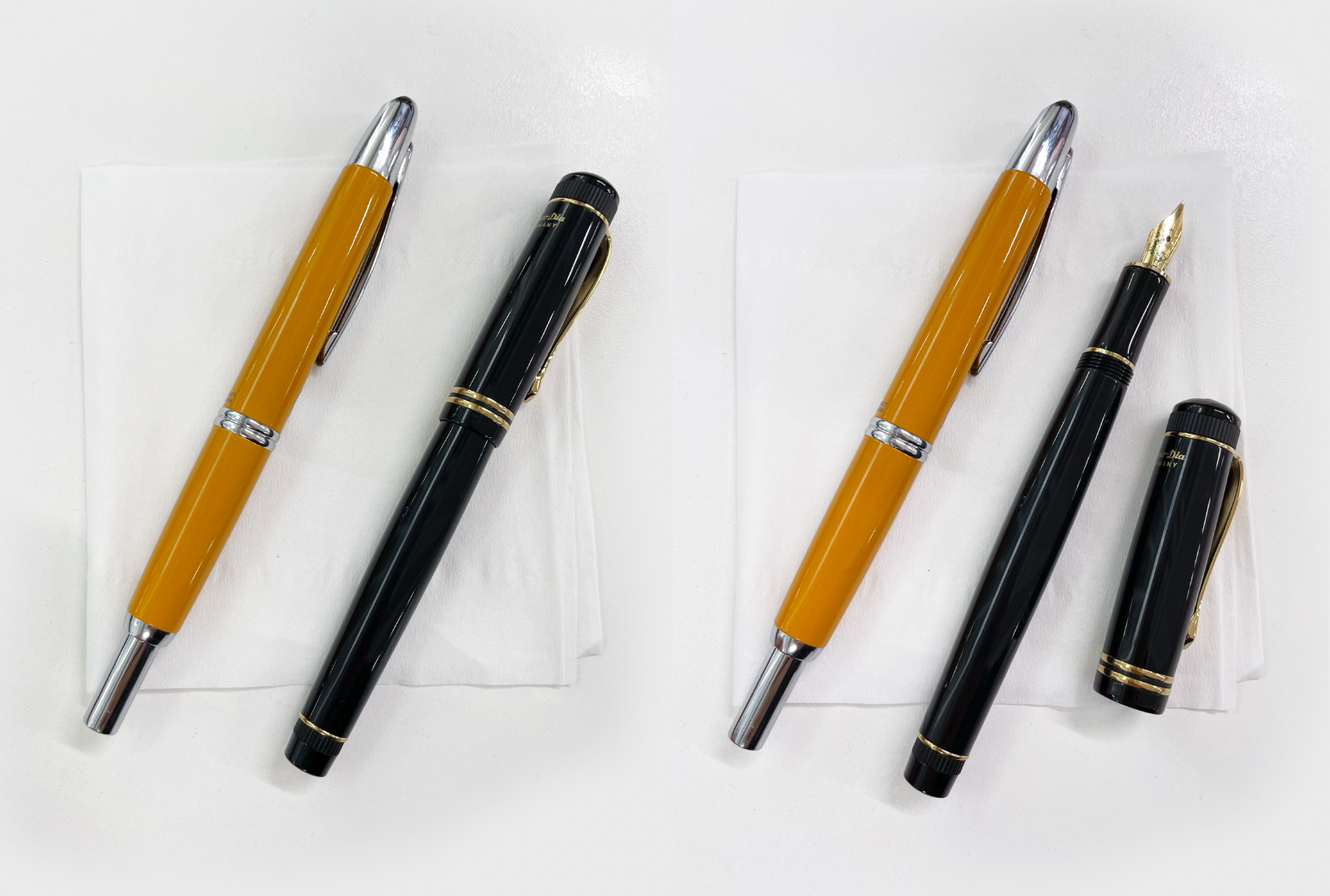 우선, 무게가 마음에 들었어. 기존 카웨코들은 허망할 정도로 가볍고 밸런스가 좋지 않았는데, 이 펜은 묵직한 편이야. (배럴 안쪽이 잘 안보이는데... 황동이지 않을까 싶고) 스포츠 같은 모델은 카쿠노보다도 가벼운 느낌이 들어서 쓰는 게 불쾌할 정도였는데, 이건 밀도가 꽤 높아. 비교로 놓은 캡리스보다 약간 가벼운 정도야. 길이는 펠리칸 200보단 약간 길 것 같은데, 배가 볼록해서 잡는 느낌은 200보다 나은 것 같아.