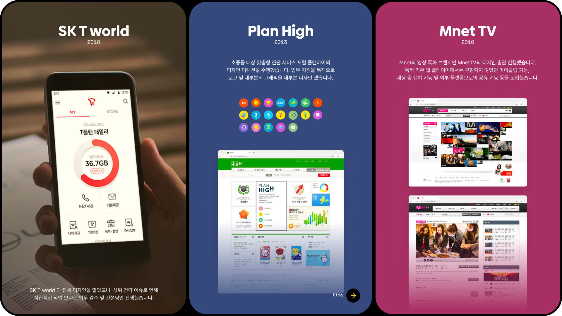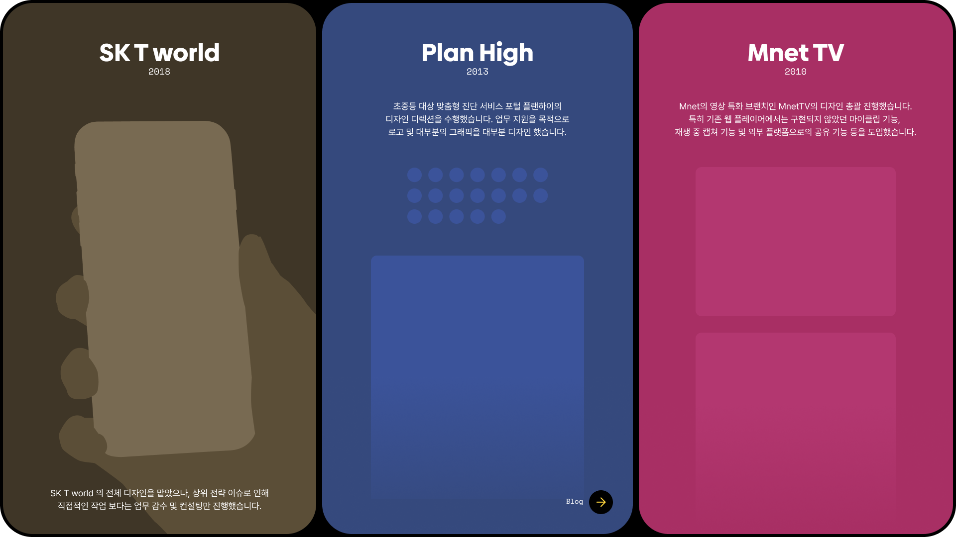한 화면에 여러 기능과 정보를 독립적으로 운용하기에 최적인 포맷 같아. 라운딩이 주는 독립성이 생각보다 대단하다는 걸 이번에 많이 느꼈어. 비록 나는 정보(텍스트)와 이미지를 나누는 정도로만 활용했지만, 좀 더 탐색하다 보면 더 많은 용도를 찾을 수 있을 것 같아. 이를테면 옛날 포폴에서는,