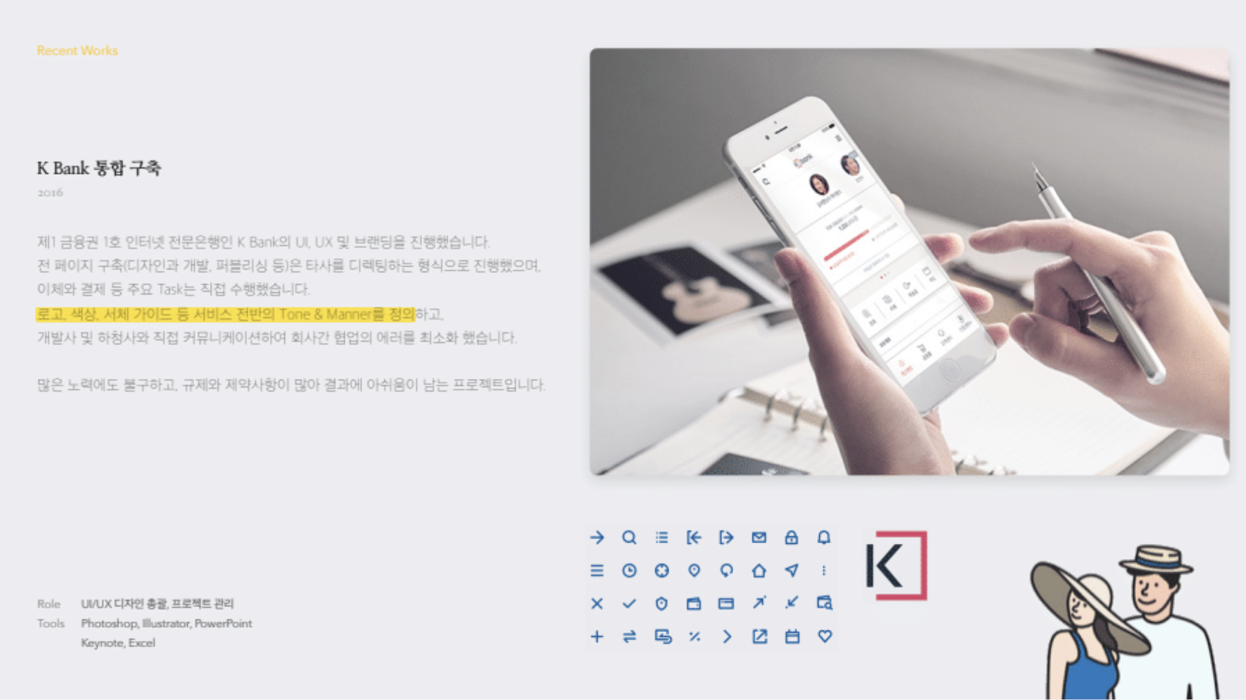 먼저, 상대가 나만큼의 정보가 없을 수밖에 없으니, ② 쉽게 이해될 수 있도록 해야 하고, ③ 흥미를 주어야 해, 최소한 재미라도 있어야 해. 포폴 자체가 즐거우면 좋겠지만, 최소한의 위트는 기본적인 덕목이라고 생각해.