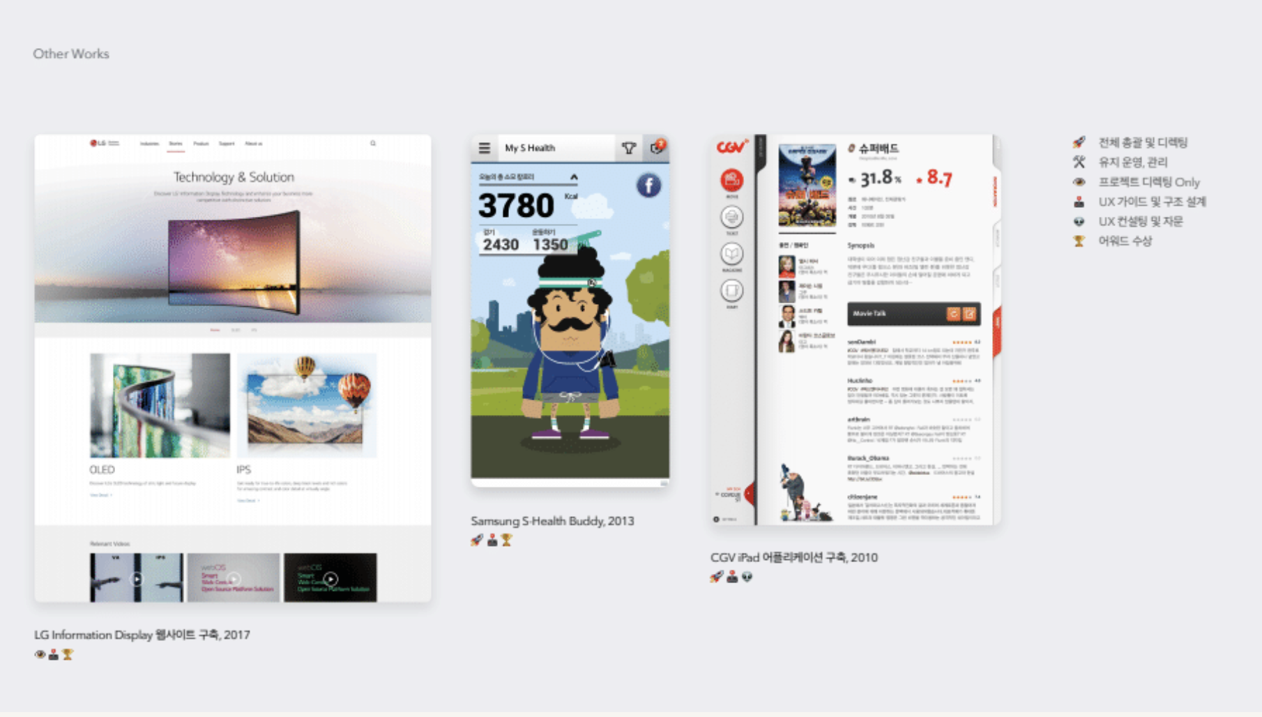 이 역시 '형식'의 덕을 톡톡히 봤어. 각각 독립적인 구조라서 막 때려 넣어도 정리가 돼 보여. 처음에 간단히 내 경력을 간략히 적고, 이전 포폴과 같이 내 장점(나는 이런 걸 잘해요, 이런 걸 좋아해요)을 소개하고, 그 뒤로는 최근의 프로젝트 다섯 개를 상세하게, 그리고 약간 중요하지만 옛날 것을 한 장에 하나만, 그리도 버리긴 아까운(?) 프로젝트를 한 장에 세 개씩, 마지막으로는 본업이 아니지만 필요할 땐 할 수 있는 일 - BX와 폰트 전체를 각각 한 장에 넣었어. 이렇게 줄이고 줄여도 70여 페이지가 나오는 건 아쉬운 부분이야. 내 압축 능력은 여기 까진가 봐.