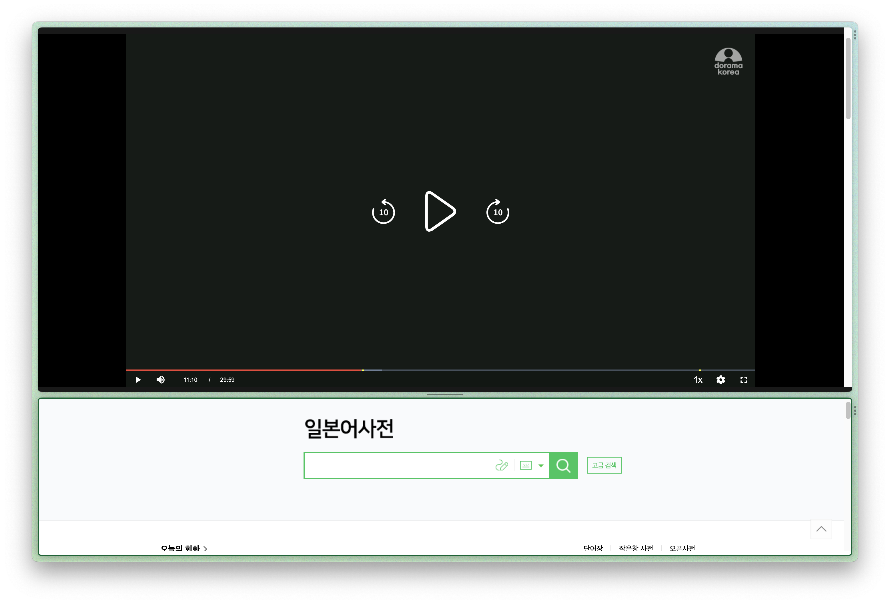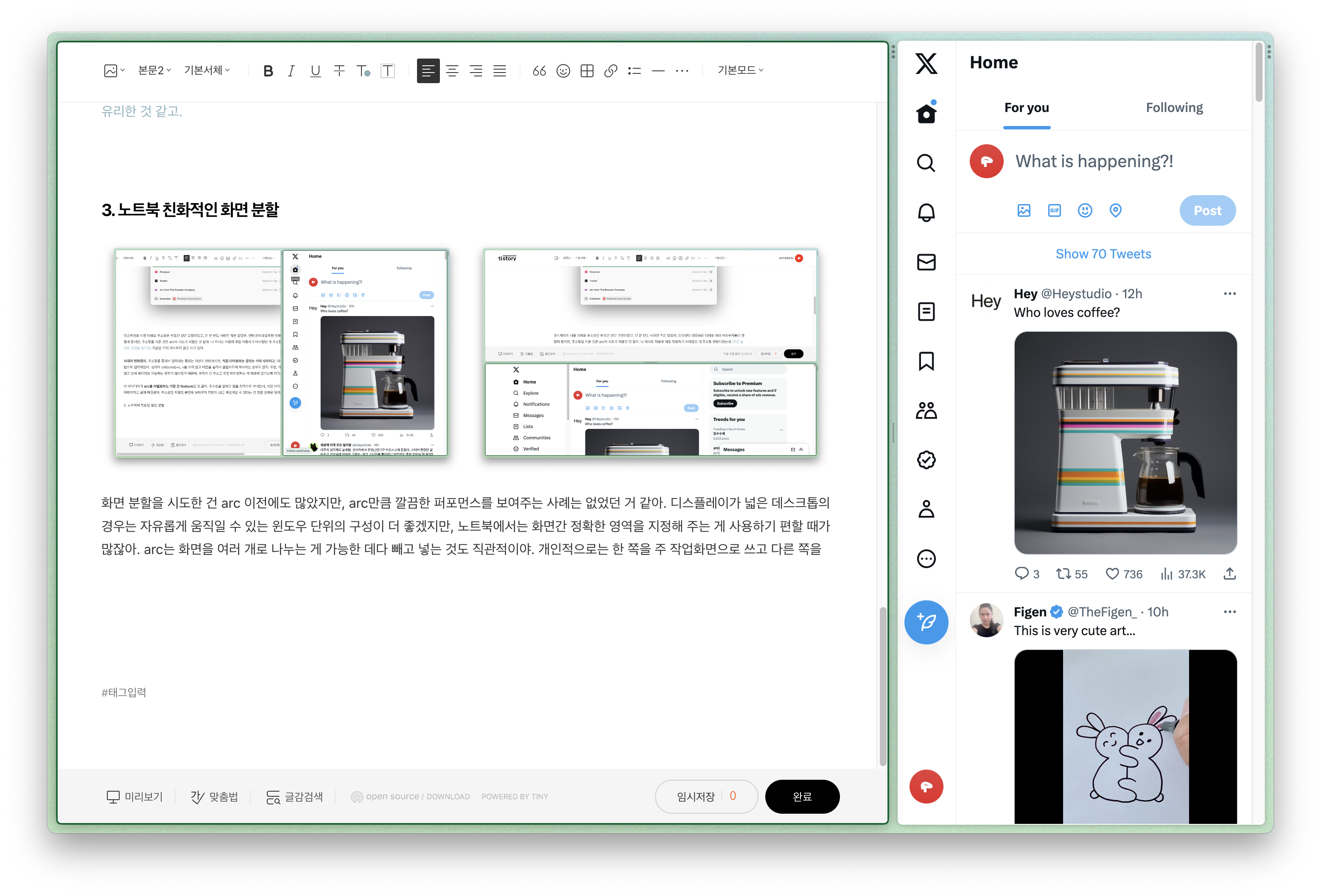 화면 분할을 시도한 건 arc 이전에도 많았지만, arc만큼 깔끔한 퍼포먼스를 보여주는 사례는 없었던 거 같아. 디스플레이가 넓은 데스크톱의 경우엔 자유로운 '윈도우 단위의 구성'이 더 좋겠지만, 노트북에서는 화면 간 정확한 영역을 지정해 주는 게 사용하기 편할 때가 많잖아. arc는 화면을 여러 개로 나누는 게 가능한 데다 빼고 넣는 것도 직관적이야. 또한 트랙패드로 조작하고 키보드를 많이 쓰는 노트북의 사용패턴에 적합하게 설계되어 있어. 개인적으로는 한쪽을 주 작업화면으로 쓰고 다른 쪽을 SNS나 동영상으로 쓰는 편이고, 가끔 영화를 볼 때는 화면을 위아래로 나누고 하단을 사전 검색으로 쓰곤 해.