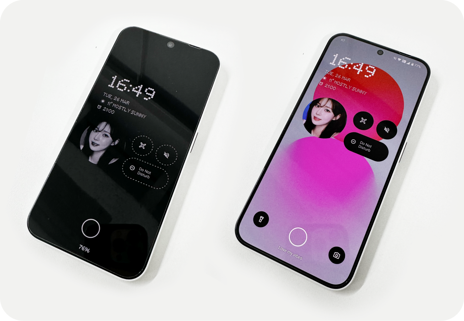 이것 말고도 간격, 배치 등 사소한 곳에서 너무 구멍이 많아. 위의 AOD 이미지를 보면, 하단의 지문 부분과 충전 퍼센트 표기의 정렬도 맞지 않고, 화면의 스케일이나 폰트 설정을 바꾸면 각 위젯이나 간격들이 틀어지기도 하고, 낫싱 자체에서 제공하는 아이콘들의 align도 애매한 것이 많고... 뜯어보면 볼수록 디자이너로서 못 참겠는 부분이 너무 많아. 기왕에 힘을 쓸 거면 좀 마무리도 깔끔하게 해 줬으면 좋았을 텐데. 너무 사소해서 말하기도 민망한 것들이 많은데... 순전히 나는 디자이너의 관점이니 일반인들이 보기엔 거슬리지 않을지도 모르지. ^^