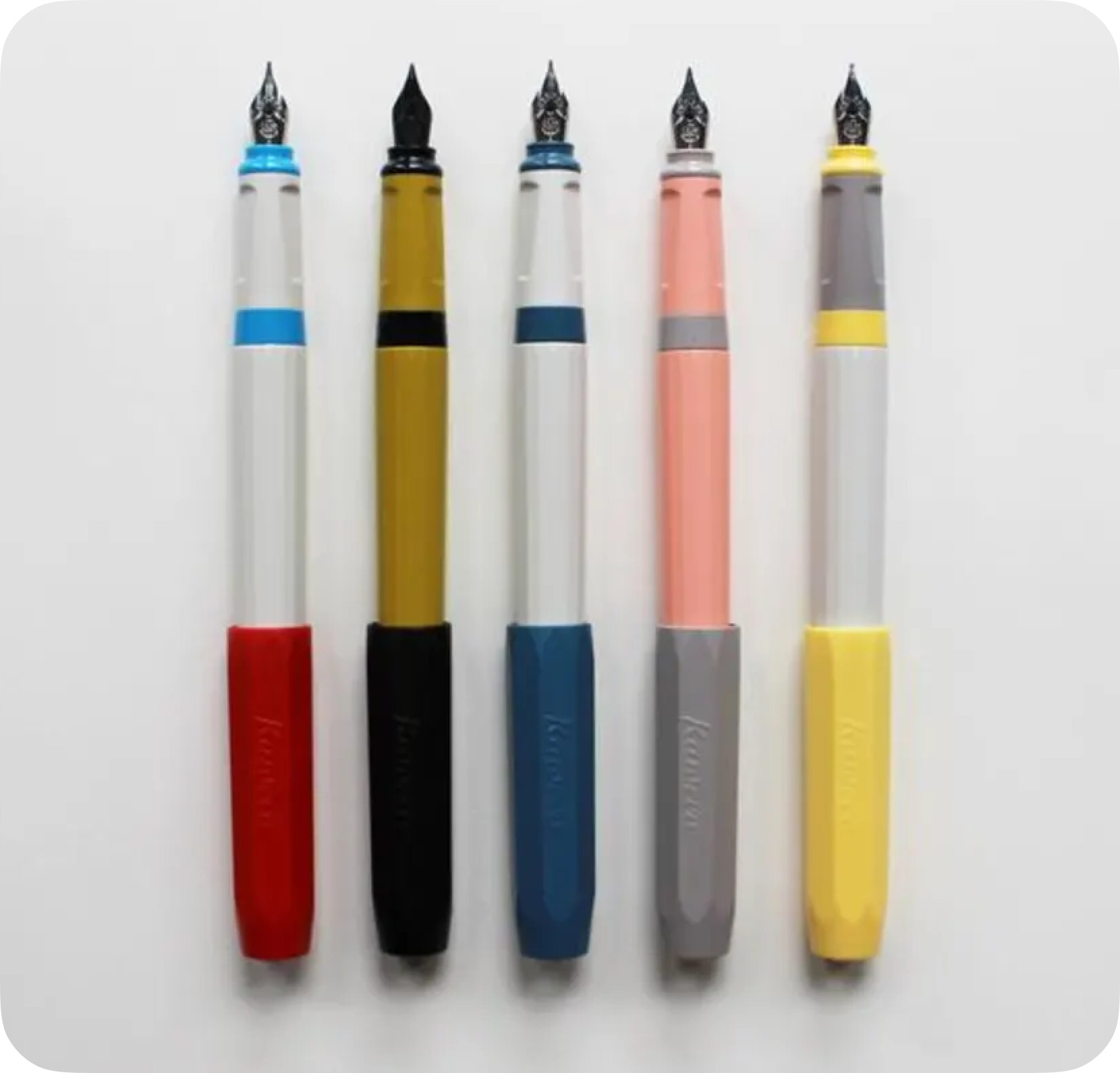 만 원 짜리라고는 생각되지 않을 정도의 겉모습이야. 원래 페르케오는 저렴이 포지션 답게 색깔 놀이를 많이 했었는데 (오른쪽 사진), 아무래도 전통의 강자인 파일로트의 카쿠노나 플래티넘의 소유성을 견제하는 의도 아니었을까. 배럴 모양은 소유성처럼 다각형의 심플한 형태인데, 캡은 카베코의 전통적인 형태야. 저렴이라서 당연히 플라스틱이긴 한데, 카쿠노나 소유성처럼 무른 재질은 아니고, 키보드 플라스틱과 비슷한 느낌이야. 그래서 정말 얼핏 보면 레진 소재인가 착각할 정도. 견고하고 각이 잘 살아있는 형태이긴 한데, 오래 쓰면 번들거리는 재질로 바뀔 것 같아. 오래 쓴 키보드처럼 말이지.