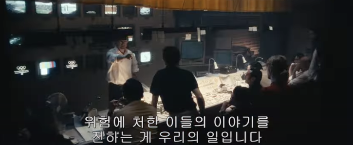 자, 등장인물은 스스로도 통제하기 어려운 '영상'이라는 무기를 들긴 들었는데... 자신과 자국의 이익을 위해서 이 사건을 어떻게 다뤄야 하는지 명확하게 이해하지는 못했어. 당황스러워. 언론인으로서 어떤 책무가 있는지를 스스로 재정의해 나아가야 하는 주인공들은 영화 내내 삐걱거려. 만일 이들이 정치사회부(영화에서는 '보도국') 출신이었다면 이야기는 조금 뻔해졌을지도 모르지만, 이 주인공들은 정치사회적인 뉴스를 어떻게 다루어야 하는지도 익숙하지 않은 스포츠국 사람들인 게 참 공교롭지.