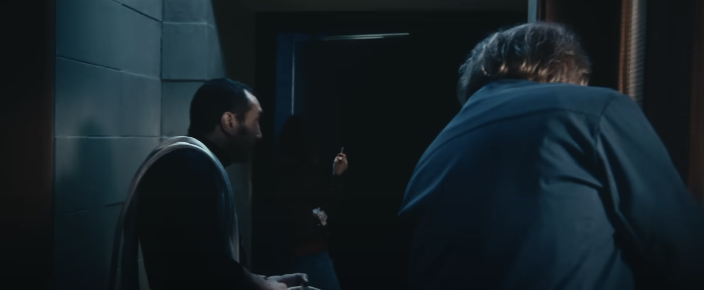 담배를 피우기 위해 살짝 연 문 틈으로 총성이 들어오는 씬이야. 실외가 처음으로 실내에 영향을 주는 장면이자, 영화 속에서만 존재하는 '가짜 실외'가 처음 등장하는 장면이야.
