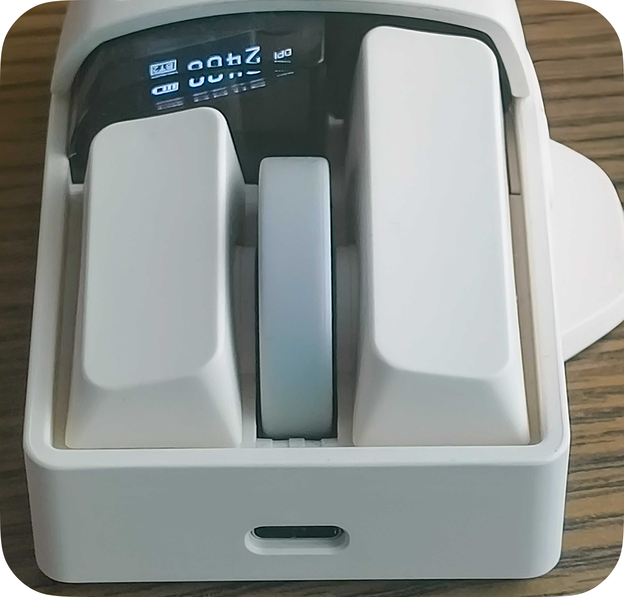 저 긴 장식같이 생긴 홈이 DPI 조절 버튼인데, 사용중에 눌리거나 하지는 않아. 롱 프레스 후 누르면 800 dpi에서 4000 dpi까지 다섯 단계로 조절이 되고, 휠을 사용하면 보다 작은 단위로 변경할 수 있어.(조작하는 게 편하지는 않아서, 자주 조정이 필요한 사람에게는 비추)