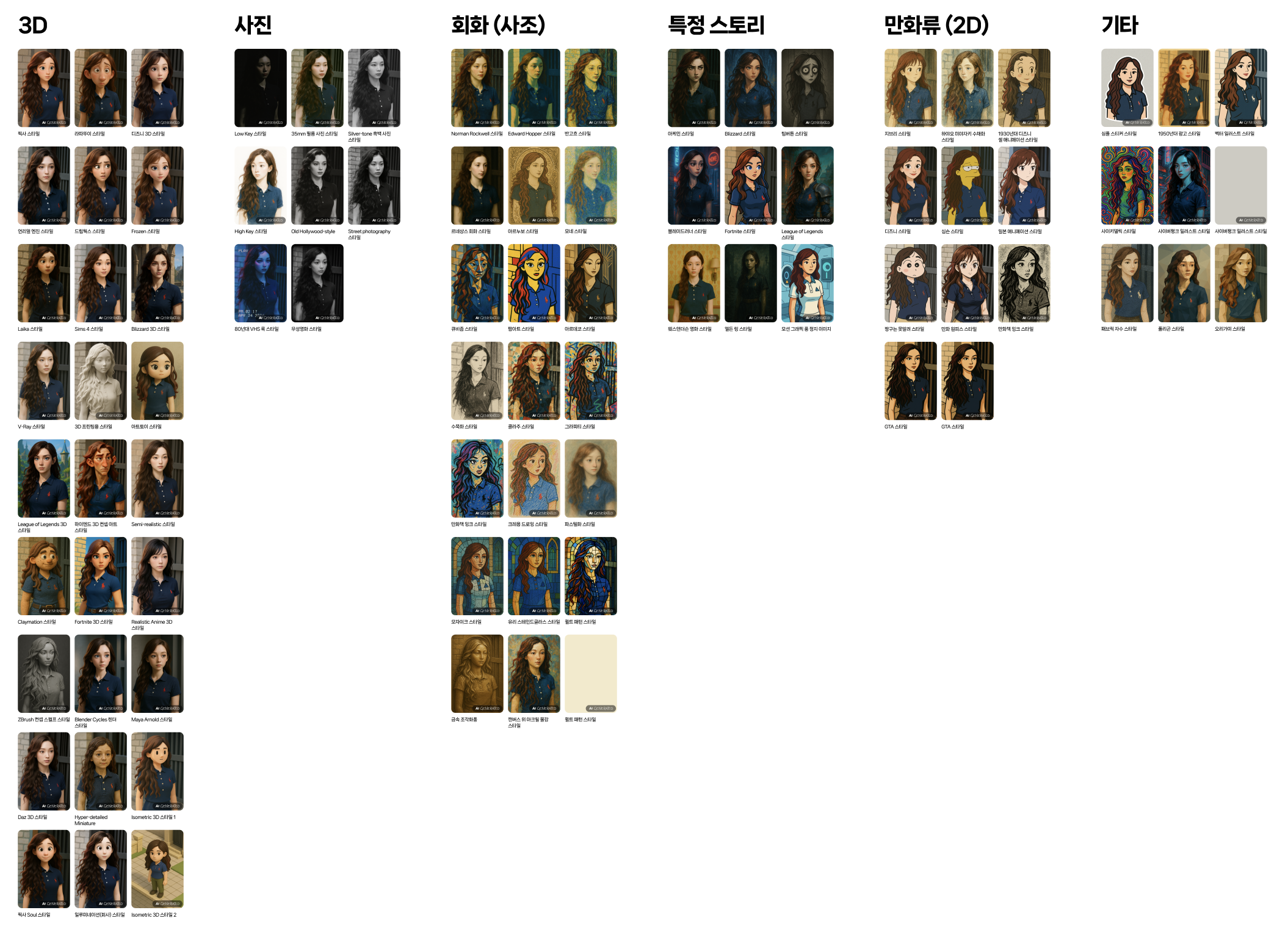 이 이미지를 지브리 스타일로, 픽사 스타일로, 디즈니 만화처럼... 등등으로 바꾸는 게 전부라서, 하는 김에 어떤 스타일이 있을지를 리스트화 하는 작업을 진행 중에 있어. 가급적 PC로 보기 바람. 원본이야 크지만, 하나씩 올리는 건 너무 피곤한 일이라서 6개씩 묶어 올릴 거거든.