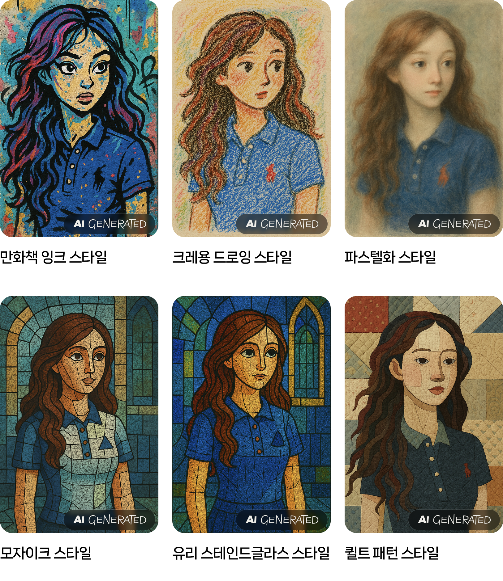 모자이크 - 유리 스테인드글라스 - 퀼트는 연속으로 생성해서 에러가 있는 것 같은데, 앞의 두 개는 몇 번을 해도 비슷하게 나오더라구. 퀼트는 이전의 작업에 영향을 많이 받는 것 같고. 느꼈겠지만, 스타일에 따라서 전형적인 포즈와 시선도 바뀌는 것 같아.