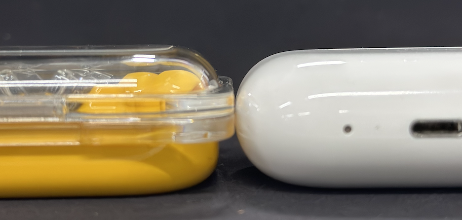 이어팁의 사이즈는 에어팟과 낫싱 모두 '미디엄'인데, 에어팟의 '라지'가 낫싱의 '미디엄'정도로 보여. 그런데 이건 재는 방식의 차이가 아닐까. 이어팁의 단단한 입구 부분의 직경은 비슷한 것 같아. 낫싱 이어팁의 유연한 부분이 더 넓게 펼쳐진 느낌. 실제로 착용해 보면 낫싱 쪽이 차폐력이 더 좋은 것 같아. 사람에 따라 호불호가 나뉠 듯. 낫싱이 조금 크긴 한데, 무게나 밀도는 에어팟이 미묘하게 더 큰 거 같아. 그래서 착용한 상태로 보면 낫싱의 존재감이 더 강한데, 착용감은 조금 더 가볍고 단단하게 물리는 느낌이야.