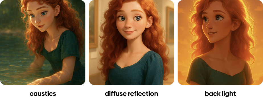 caustics는 광집효과라고 해서, 물에서 반사되는 빛들이 만드는 무늬, 또는 빛이 투명 재질을 통과할 때 만들어지는 패턴 등을 말해. 이미지에서는 두 팔에 나타나 있어. diffuse reflection은 확산되는 반사, 다양한 빛이 화면을 두루 튕겨다니면서 고르게 풍부하게 만드는 효과야. backlight는 역광. 말 안해도 알지. 백라이트는 위에서 설명한 rim light나 fresnel effect와 구별해서 쓰면 좋아.