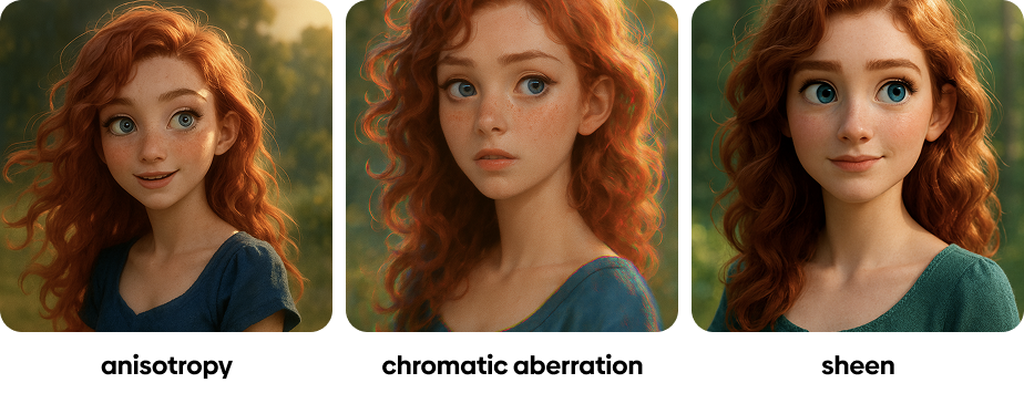 anisotropy는, 방향성을 갖는 빛의 흐름이야. 원래는 예시를 금속이나 물체로 해야 했겠지만, 모두 '붉은 머리의 여자'로 예시를 통일하는 바람에. ㅋ. 광택의 질감을 주거나, 광택에서 색상이 살짝 변하게 해주는 데 쓰면 좋아. chromatic aberration은 소위 색수차로 말하는, 색상이 빨녹파로 분리되는 현상으로 물체의 테두리에서 발생해. 주황색 머리카락 주변에서 녹색이 보이는 것이나, 앞쪽 어깨에 서툴게 적용되어 있어. sheen은 특정 오브젝트를 지칭하며 사용하면 좋은데, 직물이나 장식물들의 디테일을 올리는데 좋아. 그 부분의 빛을 평평하게 펴주면서도 디테일을 살려주거든.