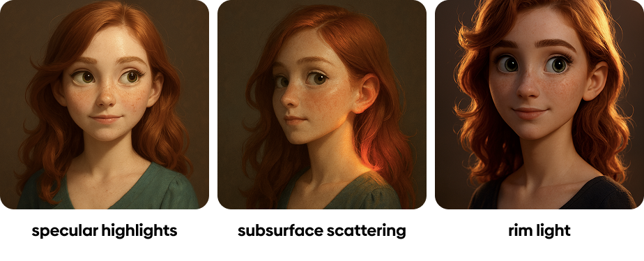 제일 많이 쓰는 것 중에 하나가 specular highlight. 소위 물광 피부를 만드는 느낌인데, 콘트라스트가 강한 '빛의 점'을 만들어 주기 때문에 디테일이 높아 보이는 장점이 있어. 두번째는 3D에서 SSS라고 부르는, subsurface scattering. 피부 속에서 빛이 반사되는 느낌인데, 볼이나 귀 끝을 잘 봐봐. 인물의 경우 이게 적용되면 약간 클래식한 느낌으로 이미지 톤이 잡히는 것 같아. rim light는 역광과는 다르게, 테두리에 떨어지는 광선이라서 'back light'라고 말하는 것보다 인물의 외모를 잘 살릴 수 있어.