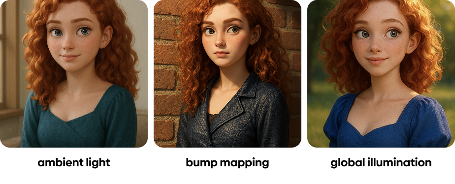 ambient light는 광선 방향이 불분명한 확산광이야. 그래서 화면 전체를 부드럽게 만들어. 여기에 색상을 섞어주는 표현을 쓰면 또 그것 나름 독특한 느낌을 만들 수 있어. bump mapping은 정말 3D 용어이긴 한데, 3D 매핑을 하지 않고, 단순한 큐브에 이미지로 패턴을 주는 트릭같은 방식이야. 실제로 AI가 이 프롬프트를 어떻게 해석하는지는 모르지만, 복잡한 것이 반복될 때 쓰면 그 쪽을 '덜 중요하게' 판단하는 것 같아. 이 이미지의 경우에는 벽돌 벽에 그 프롬프트를 적용했어. 마지막으로 global illumination은, 전체적으로 균형있게 광선을 조절하는 효과가 있는 것 같아. 전역조명이라고 번역하는데, 이론적으로는 다양한 반사광이나 간접조명의 효과를 극대화하는 데 사용돼.