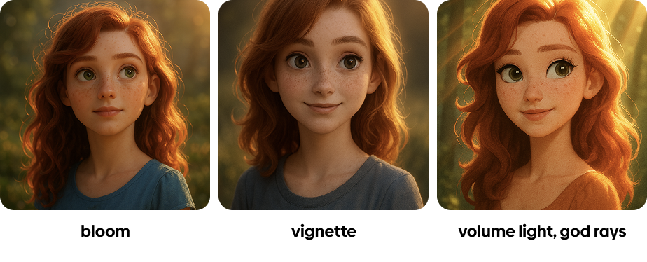 bloom은 빛 확산이야. 하이라이트 광선이 대상에만 맺히지 않고 주변의 공기에도 묻어 번지는 효과야. vignette는 많이들 알겠지만, 비네팅, 화면 주위를눌러서 가운데가 돋보이게 하는 효과이고, volume light, 흔히 god rays는, 먼지가 많은 곳에서 빛줄기가 나타나는 것을 말해.