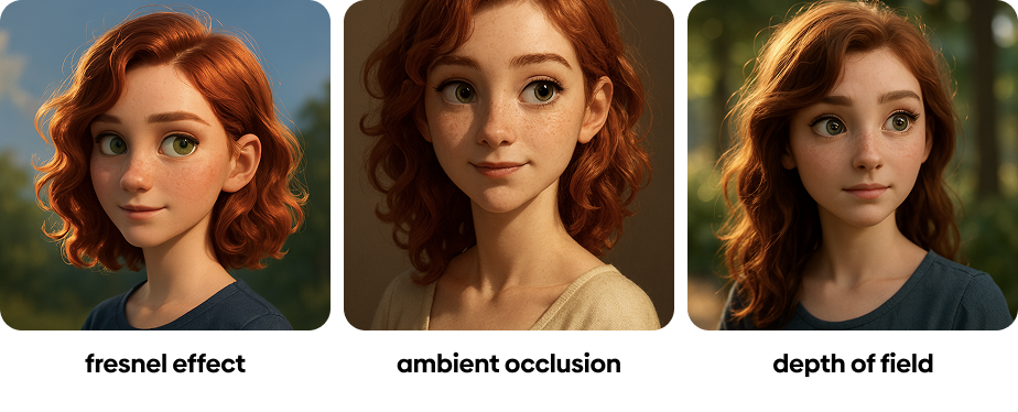 fresnel effect는 설명하기 조금 어려운데... 카메라에 대해서 비스듬하게 배치된 오브젝트의 반사가 강해지는 현상이야. 이 이미지에서는 눈동자 테두리와 머리카락 가장자리, 볼과 턱의 경계 부분에서 미묘하게 볼 수 있어. ambient occlusion은 SSAO라고도 불리는데, 틈이나 음영의 디테일을 잡는데 좋아. 이미지를 크게 쓰면 좋겠지만... 콧망울 아래, 입술 아래의 그림자들을 관찰해봐. depth of field는 말 그대로 망원렌즈 촬영에서 배경을 날리는 효과야.