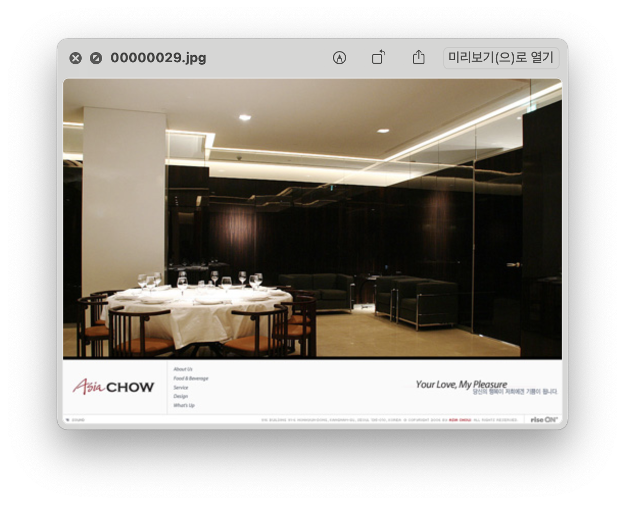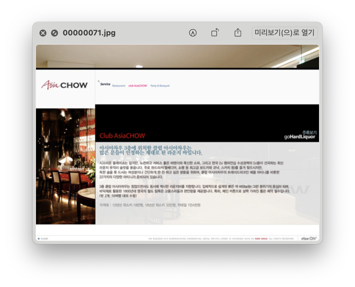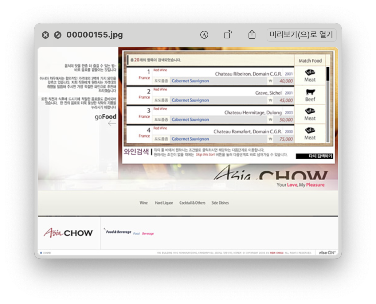 도산공원 사거리에 있던, Mr.Chow의 우리나라 이름인 'AsiaChow'의 웹사이트야. 정말 - 혼자 다 했던 프로젝트.^^ (물론, 정보를 정리해 주던 기획자 누님과, 내 작업을 서포트했던 두 명의 주니어들의 공을 잊지는 않았지만, 거의 모든 결정과 집행과 진행을 혼자 다 했단 의미)
