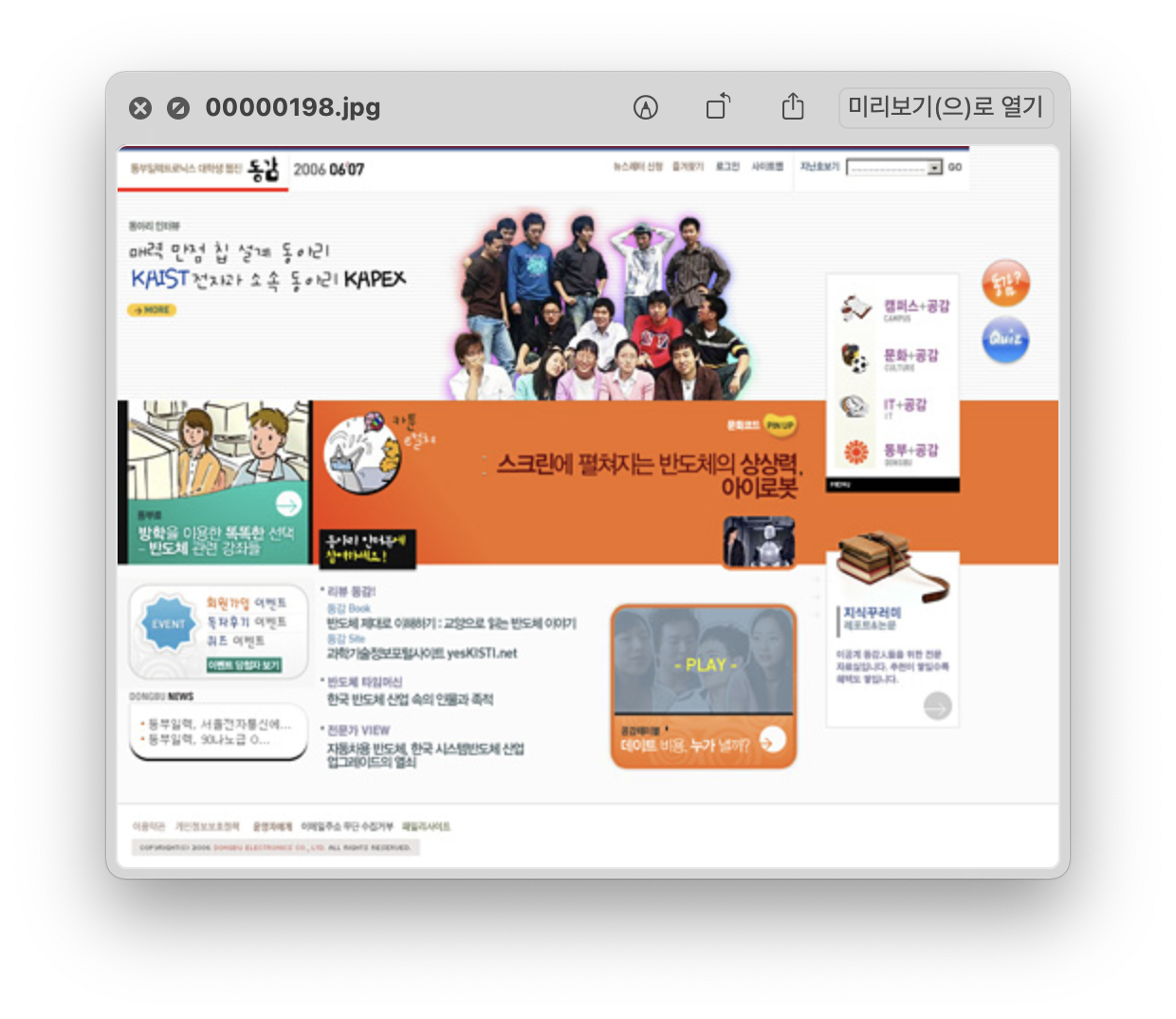 애니파인더의 고정 수입이었던 웹진 '동감'이야. 2000년대 초반에는 웹진이라는 게 유행이었어. 잡지를 그대로 웹에 녹일 수 있을까 탐색하던 시절이었지. 동부 측에서 사보 텍스트를 파일로 주면, 알아서 고른 후 웹진으로 만드는 작업이었어. 동감은 전혀! 디자인에 대한 터치가 없어서, 매번 내 맘대로 디자인할 수 있었고, 온갖 실험을 다 했었지. (지금 DB가 이때의 동부그룹이었어.)