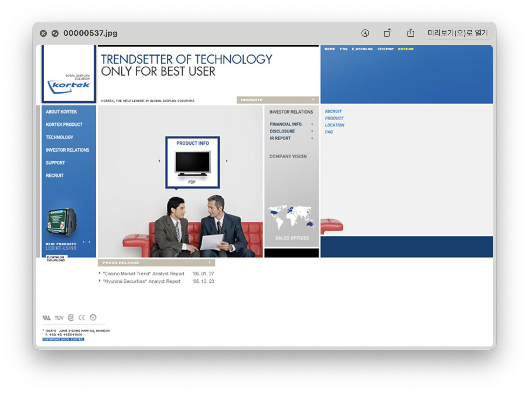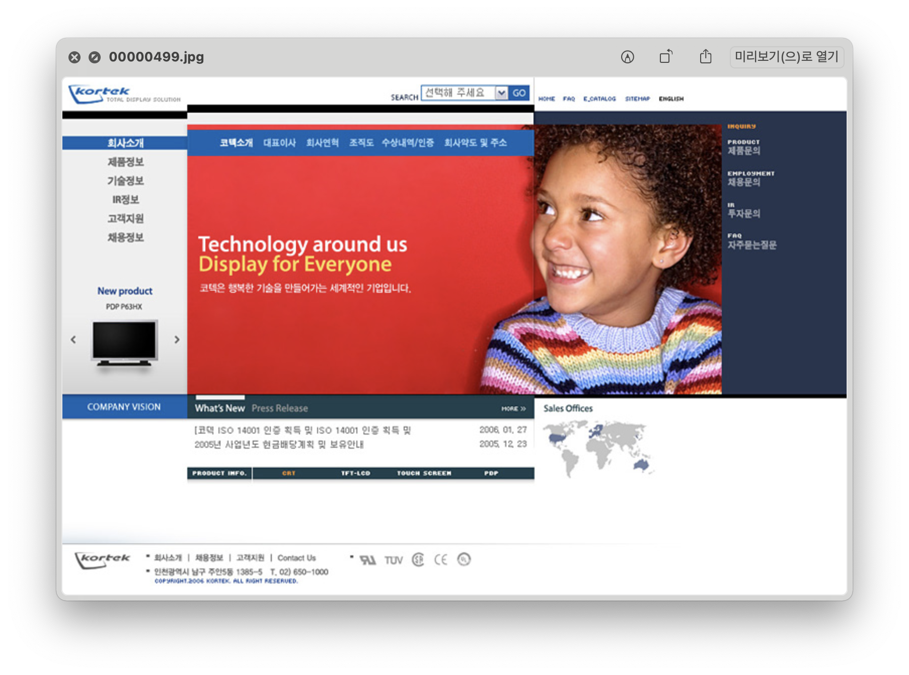 한국 이민 1세대 창업주가 미국 카지노에 모니터를 납품해서, 한 때 미국 내 모니터 매출 1위를 했다는 입지전적 회사 Kortek의 웹사이트야. 이 때는 그리드 개념에 심취해 있어서, "어떻게 하면 모든 해상도에 잘 대응할 수 있을까"가 고민이었어. (요즈음의 그리드 개념이 아니라, 단순히 '빈 곳을 어떻게 메울까' 정도의 고민이었어.) 여담으로, 시안에서 흑인을 썼다고 대차게 까였던 기억이 있어. 미국 생활을 하면서 흑인에 대한 편견이 생기셨나 봐. ("어디 깜둥이를 우리 홈페이지에 박아!!") 참고로 이 때는 벨기에의 에이전시 Group94의 영향을 많이 받았어.