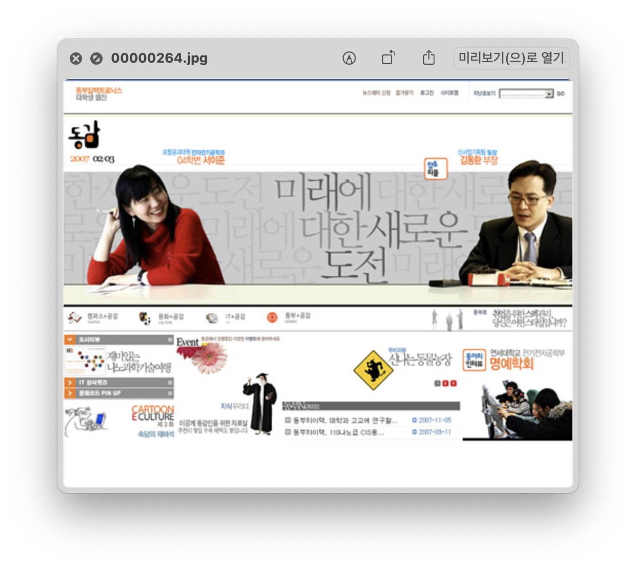 애니파인더의 고정 수입이었던 웹진 '동감'이야. 2000년대 초반에는 웹진이라는 게 유행이었어. 잡지를 그대로 웹에 녹일 수 있을까 탐색하던 시절이었지. 동부 측에서 사보 텍스트를 파일로 주면, 알아서 고른 후 웹진으로 만드는 작업이었어. 동감은 전혀! 디자인에 대한 터치가 없어서, 매번 내 맘대로 디자인할 수 있었고, 온갖 실험을 다 했었지. (지금 DB가 이때의 동부그룹이었어.)