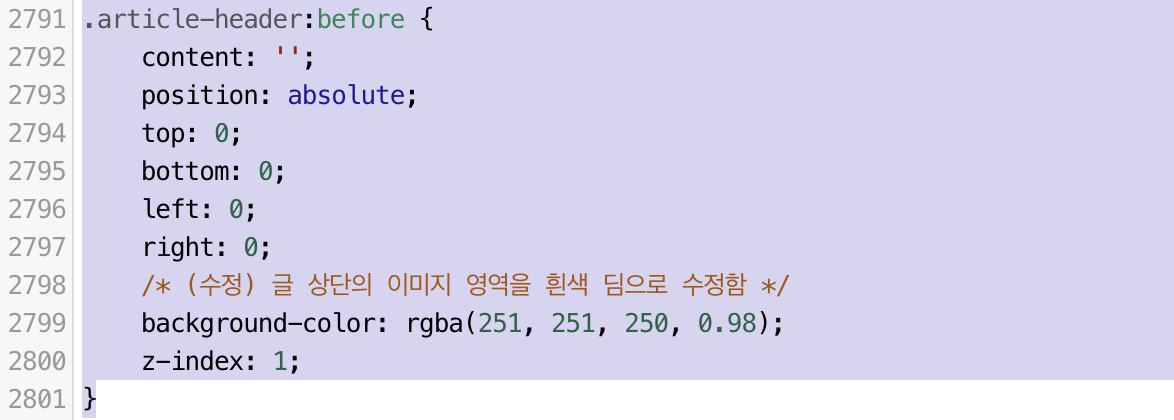 원래는 본문 상단에 이미지가 나오고, 그 위에 흰색 글씨가 얹히는 형태였는데, 나는 이미지를 앞에 쓰는 편이라서 중복이 생기는 데다, 이미지를 크게 늘이기 때문에 생기는 깨짐 현상도 눈에 거슬리더라구. 그래서, 이미지를 거의 보이지 않게 하고, 극소의 비침만 보이도록 수정했어. 원래는 이미지 영역을 아예 삭제하고 싶었는데, 좀 꼬이는 상황이어서, 이렇게 타협했어. 배경색을 바꾸고, 글자 색상 변경.