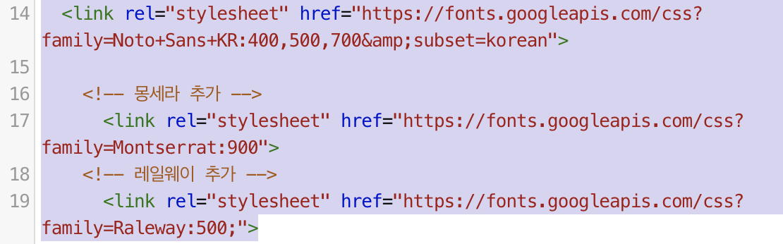 나는 폰트가 중요한 사람이라, 간단히 영문 폰트 2개를 추가했어. Raleway는 메뉴에 쓰기 위해 가져왔고, Montserrat는 홈 상단의 큰 슬로건에 사용하려고 임베드했어. 이미 Odyssey 스킨은 노토산스를 구글 폰트 사이트(fonts.google.com/)에서 가져 와 쓰고 있어서, 그 형식을 똑같이 두 개 더 쓴 것 뿐이야. 하지만, 아무래도 임베드는 화면을 느리게 만들기 때문에, 최소한의 부분에 썼어.