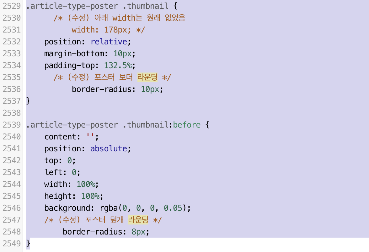 a. 원래 odyssey 에러인지, 수정하다가 생긴 건지는 모르겠지만, 포스터형 리스트에 좌우 스크롤이 생기더라구. 라운딩이 없었을 땐 몰랐는데, 라운딩을 넣고 나니, 우측 라운딩이 좀 깨지는 게 보였어. '.article-type-poster .thumbnail' 이 부분이니까 수정이 필요하면 찾아보길 바라. 라운딩이 없으면 티가 안나. ^^