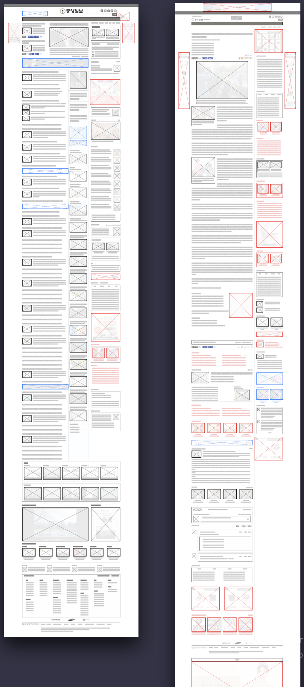 위 이미지는 2014년까지 중앙일보의 화면에 붙어있던 광고를 보여주기 위해 그린 거야. 붉은 색이 광고지. 그나마 홈이나 각 섹션 메인은 광고가 적은데, 기사 화면의 광고 개수는 평균 35개, 많은 경우는 45개까지 붙어 있는 걸 봤어. 2015 전면 개선을 통해서 절반 이하로 낮추긴 했는데, 최근에 다시 늘어난 것 같아. 언론이 지면에서 디지털로 전환하면서 제대로 된 수익모델을 만들지 못하다 보니 자꾸 광고를 붙이게 되고, 자본주의의 특성상 계속 늘어나는 거지.