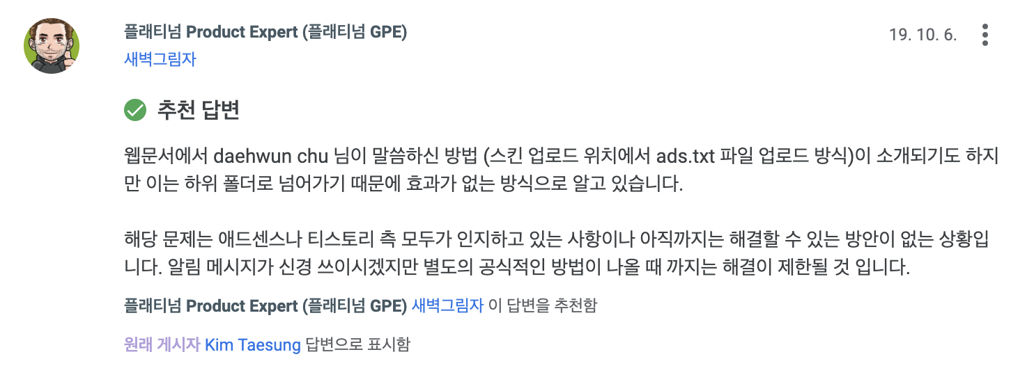 스킨 편집 모드에서 ads.txt를 업로드하면 된다고 하는데, 이미지 폴더로 리디렉션 되어 저장되는지라 - 아마도 효과가 없을 듯한데, 역시나 구글 어드바이저는 '해결책이 없다'고 하고... 기대는 안 하지만, 그래도 혹시 몰라 images 폴더에 ads.txt 파일 올려놨어. 구글의 인공지능이 현명하게 크롤링(?)하면 파일을 인식할 수 있지 않을까 하는 헛된 기대. ^^