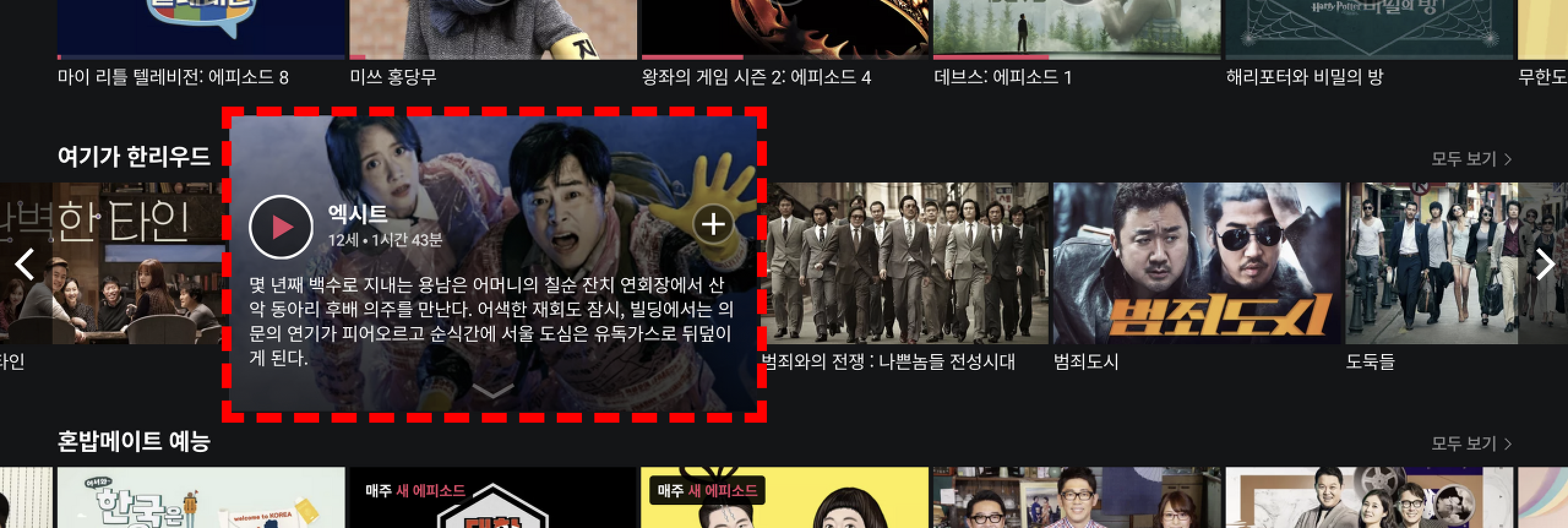 그래서, 하나를 선택했을 때 추가정보를 보여주는 UI도 서로 차이가 있어. 넷플릭스는 추가정보를 검토하라고 일단 멈추도록 — 가로로 흐르던 정보를 세로로 펴면서 멈춰. 이에 비해, 왓챠는 되게 한국적이야. 가로의 흐름을 유지한 채로 줄거리를 대충 알려주고, 볼래? 아냐? 아니면 다음으로 넘어가고. 응? 얼른 골라. 하는 거지. 그래서 높이의 변화도 크지 않고, 시선이 움직이는 범위도 작아. '빨리빨리 민족'다운 UI. ^^