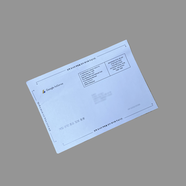 아시아 애드센스 총괄을 말레이시아에서 하는 건지, 발송지가 Special Project Unit - Malaysia Int'l Hub로 되어 있고. 우하단에는 KR 일련번호가 적혀있어. 어떤 블로그를 보니 이 편지 발송지가 벨기에로 되어 있던데, 그 사이에 업데이트된 걸까?